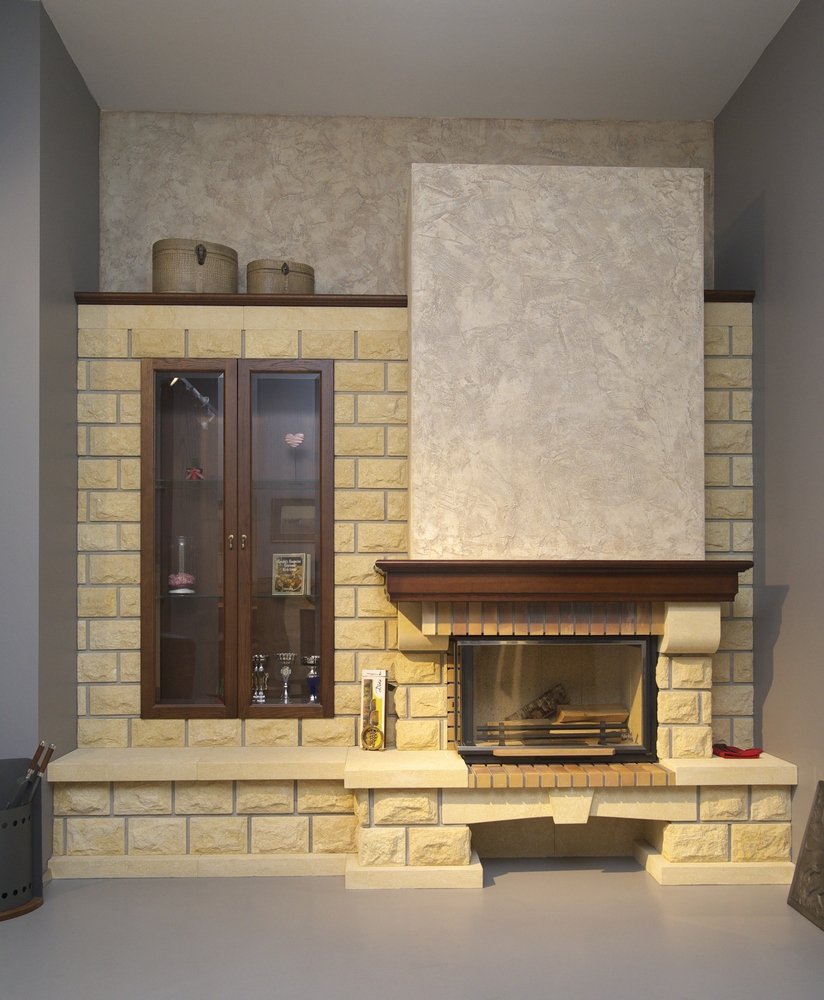 Данная каминная облицовка удачно объединила между собой элементы, выполненные в традиционном рустикальном стиле и современные детали. На передний план выступает Д-образный портал в стиле «рустик» с классической балкой и дымоходом. На заднем плане находится стена из грубого камня со встроенным шкафом. Совершенно неожиданно и оригинально смотрятся на этом фоне стильные современные стеклянные дверцы шкафа.